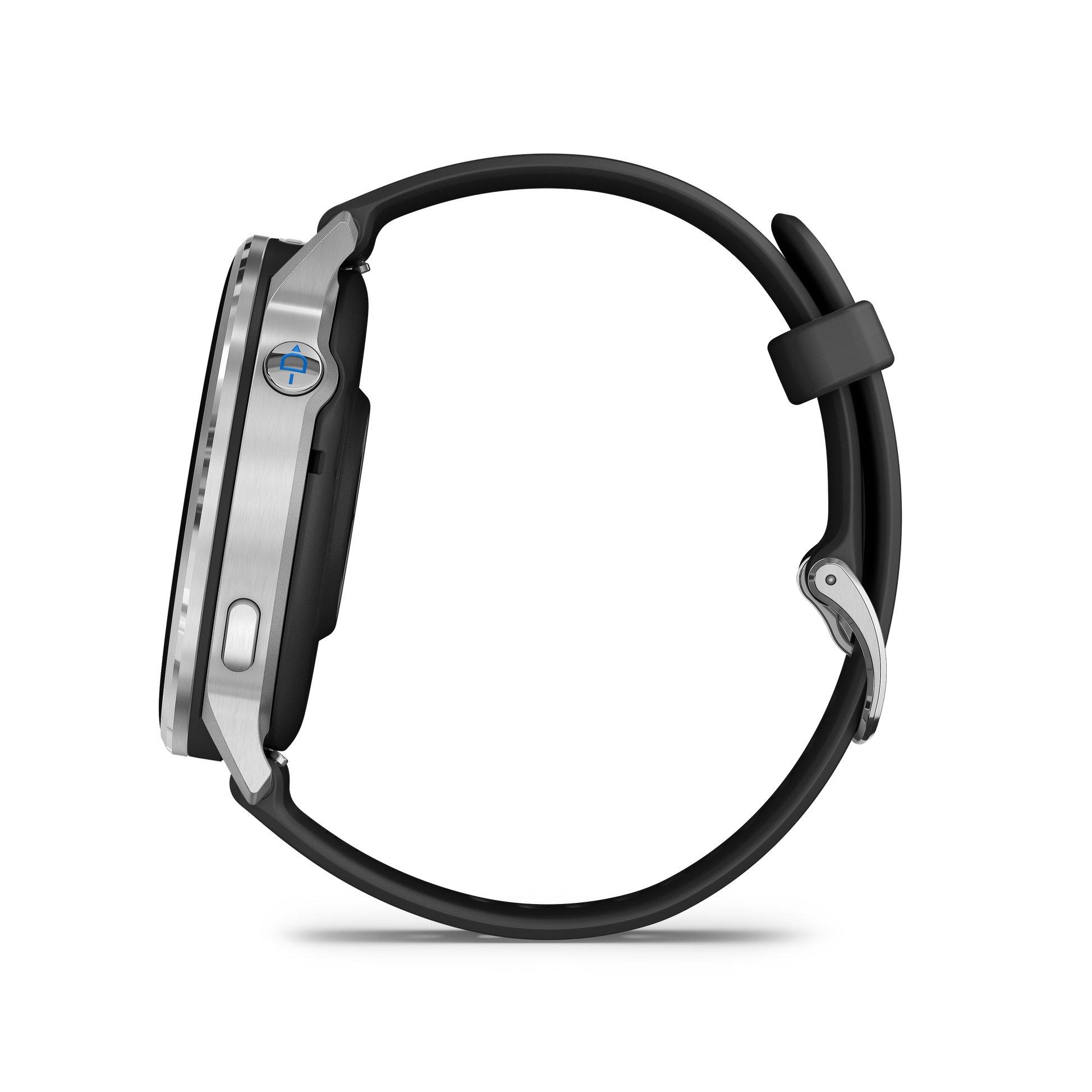 - Black silicone band designed for comfort and sweat resistance