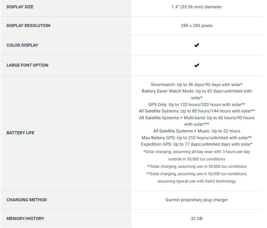 • Extreme Battery Life: Up to 320 hours in GPS mode with solar charging and 90 days in smartwatch mode.
