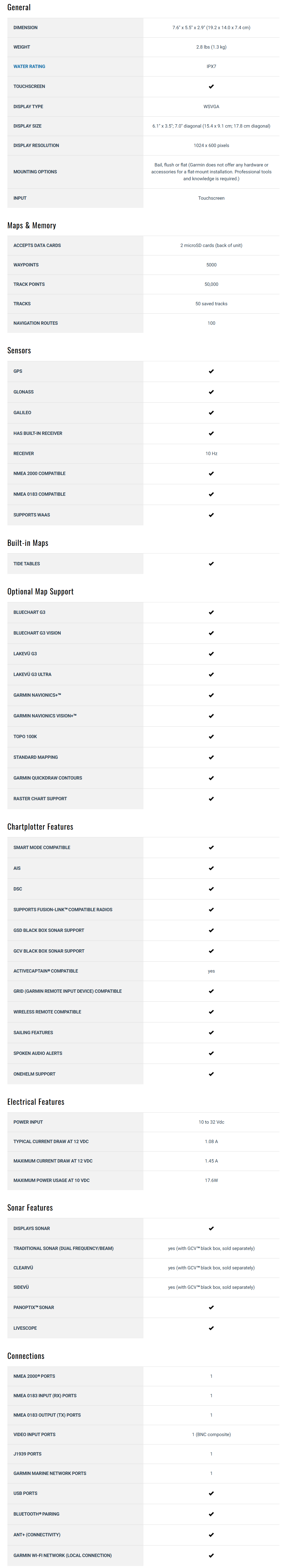 - Mapping: Preloaded with Garmin Navionics+™ maps for comprehensive coastal and inland coverage.