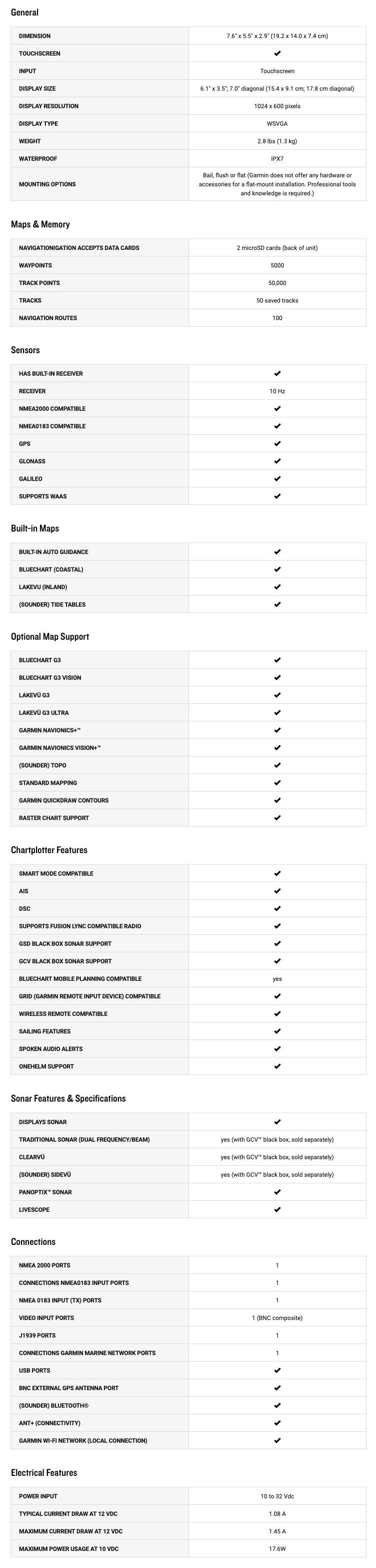 • Preloaded Mapping: Access BlueChart g3 coastal charts and LakeVü g3 inland maps with integrated Garmin and Navionics content.