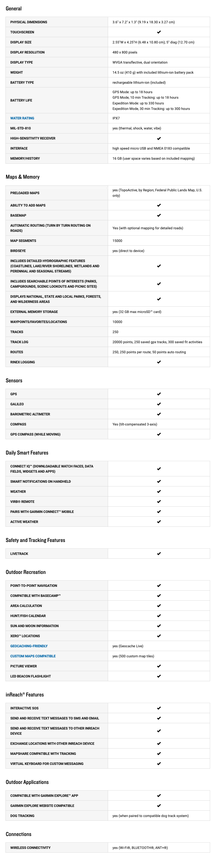 - Satellite Connectivity: InReach satellite technology for global messaging and SOS capabilities.