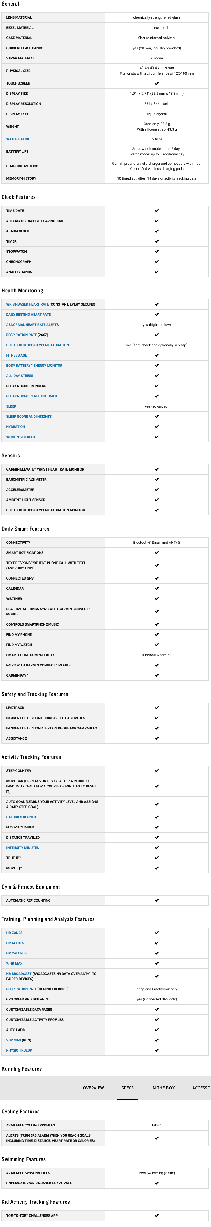 - Health Monitoring: Advanced features like Body Battery™ energy monitoring and wrist-based heart rate tracking.
