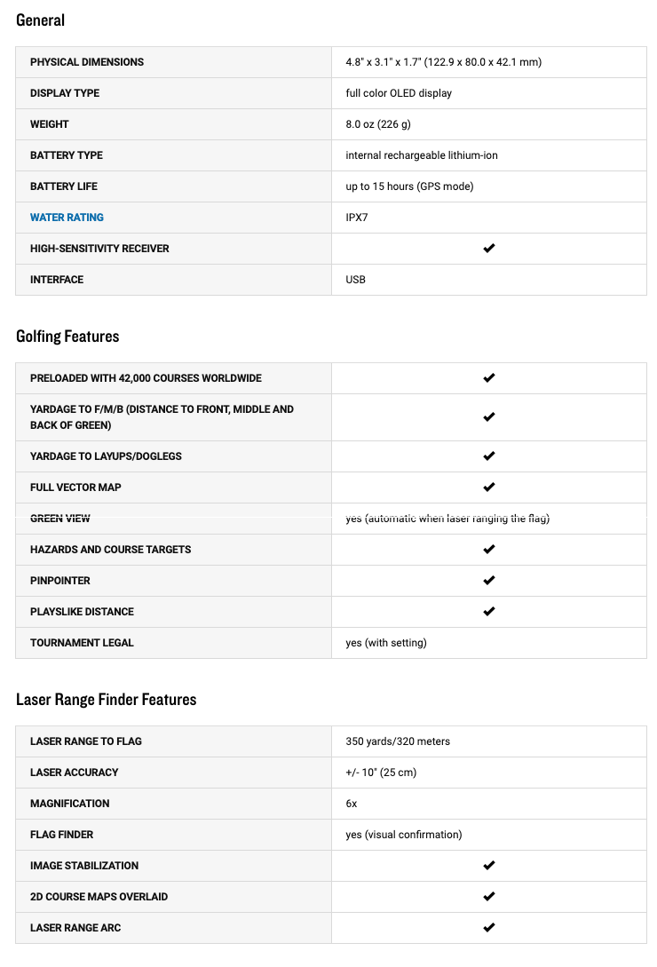 - Mediciones de precisión: Obtenga las mediciones de distancia láser más precisas al pin, con un margen de solo 10 pulgadas, en un rango de hasta 350 yardas (320 metros).