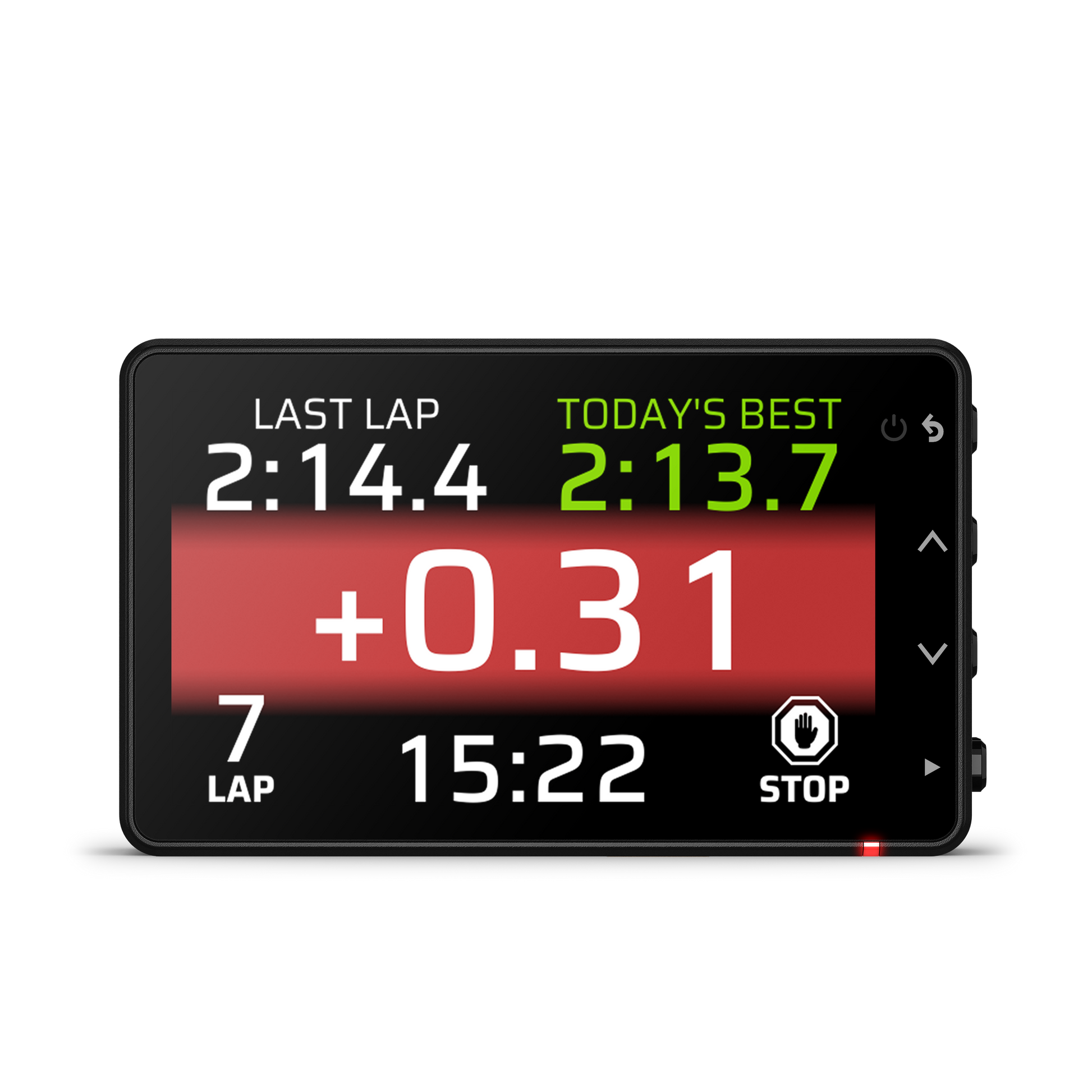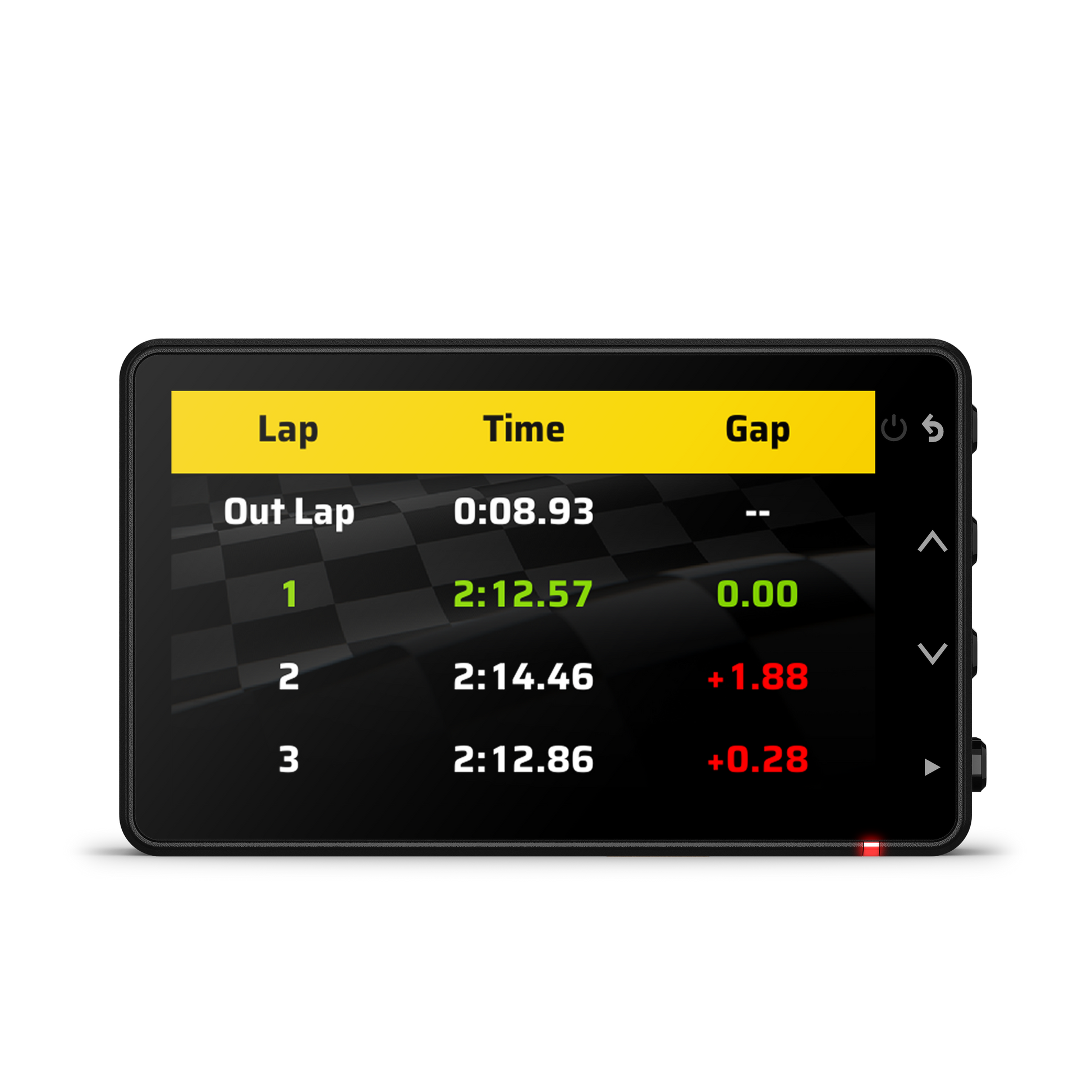 - On-device lap data including last lap time, best lap time, and adaptive delta time (with red/green gradient) plus total session time and laps completed.