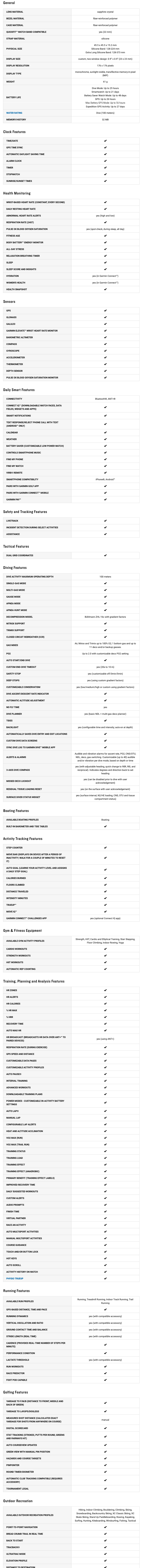 - Capacidad de registro de inmersiones: almacene detalles de hasta 200 inmersiones y cargue, comparta y revise fácilmente sus experiencias de buceo a través de la aplicación Garmin Dive.