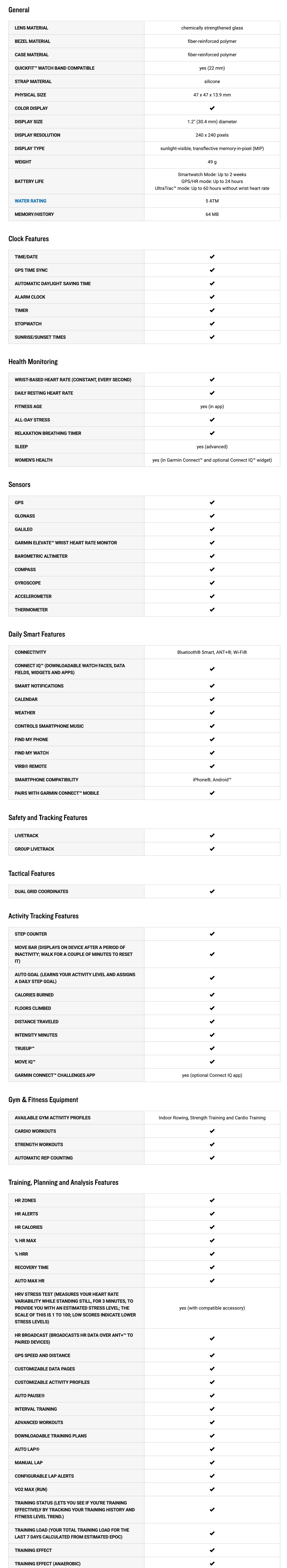 - Notificaciones inteligentes: manténgase conectado con notificaciones inteligentes, cargas automáticas a Garmin Connect y funciones de seguimiento en tiempo real como LiveTrack y GroupTrack.