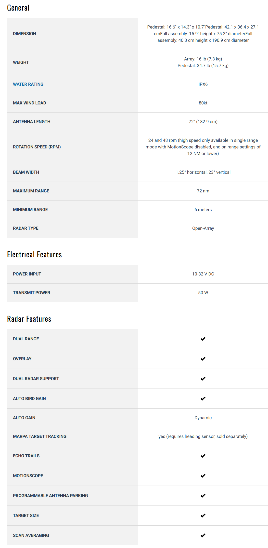 The Garmin GMR Fantom 56 outperforms many competitors with a 50-watt output, allowing for target detection up to 72 nautical miles—a significantly higher range compared to similar models. Its MotionScope™ technology can effectively differentiate moving objects, enhancing the safety of any maritime excursion with up to 30 tracked moving targets.