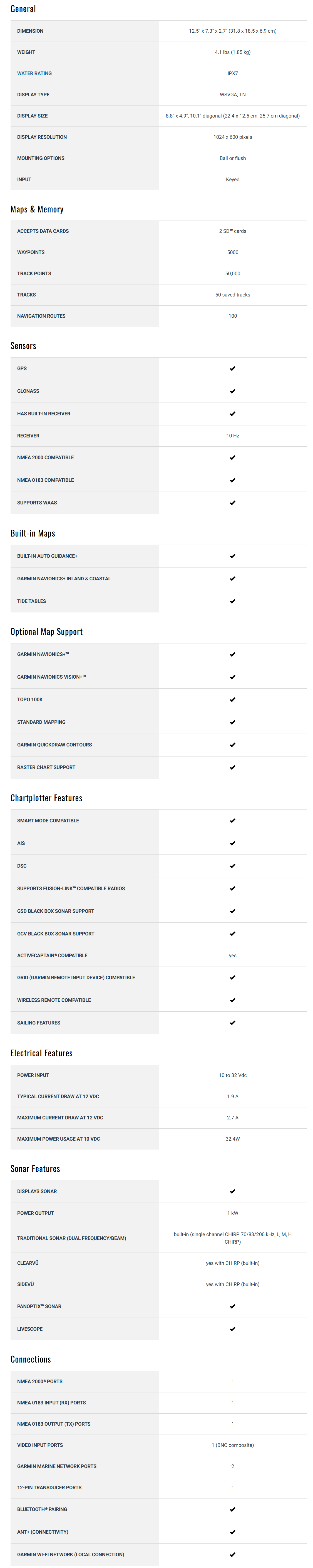 - Built-in Maps: Preloaded Garmin Navionics+™ coastal and inland charts.
