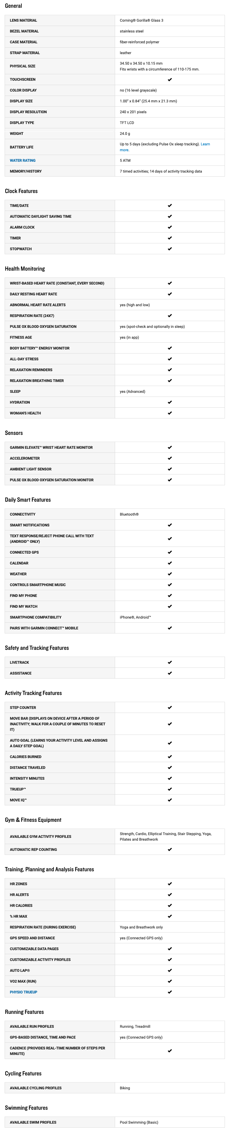 El Garmin Lily es perfecto para el uso diario gracias a su diseño liviano y su lujosa correa de cuero italiano. Elija entre varios estilos clásicos y deportivos para combinar con su personalidad y ocasión. Este reloj inteligente, que cuenta con muchas funciones pero es pequeño en su muñeca, está diseñado para complementar su estilo de vida.