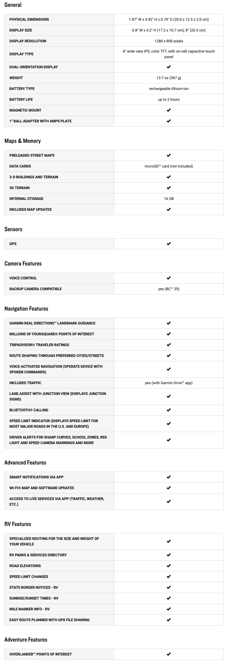 - Rutas personalizadas para vehículos recreativos: rutas personalizadas que tienen en cuenta el tamaño y el peso de su vehículo recreativo, lo que garantiza la mejor ruta de viaje. Guarde perfiles para varios vehículos o remolques.